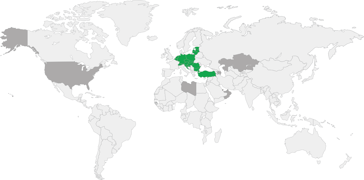 Polska, Czechy, Słowacja, Niemcy, Austria, Szwajcaria, Estonia, Litwa, Łotwa, Bułgaria, Rumunia, Słowenia, Chorwacja, Węgry, Turcja, Holandia, Belgia.